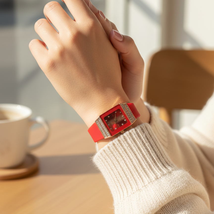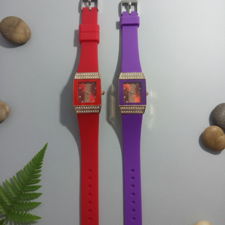 Enhance Your Style With The Luxury Women’s Diamond Quartz Watch, Designed For Elegance And Everyday Wear. Featuring A Beautiful Square Dial Decorated With Sparkling Crystal Stones, This Watch Combines Sophistication And Modern Design. The High-Quality Quartz Movement Ensures Accurate Timekeeping, While The Soft Silicone Strap Offers Comfort And Durability. Perfect For Casual, Party, Or Formal Occasions, This Watch Adds A Touch Of Glamour To Any Outfit. Available In Multiple Attractive Colors, It’s A Perfect Blend Of Fashion And Function For Modern Women.