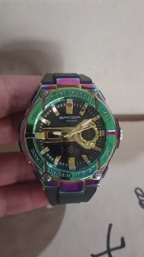 This SANDA watch is built to endure the elements, featuring a reinforced composite housing that protects the intricate internal movement. The dial showcases a sophisticated multi-dimensional layout, highlighted by a signature gold-tone bridge that secures the analog hands over a digital display. Designed with a moisture-wicking silicone band and an oversized, knurled bezel, this timepiece ensures a secure fit and easy operation during high-intensity activities. Its water-resistant construction and reinforced crystal make it a reliable companion for everything from jungle treks to urban exploration.